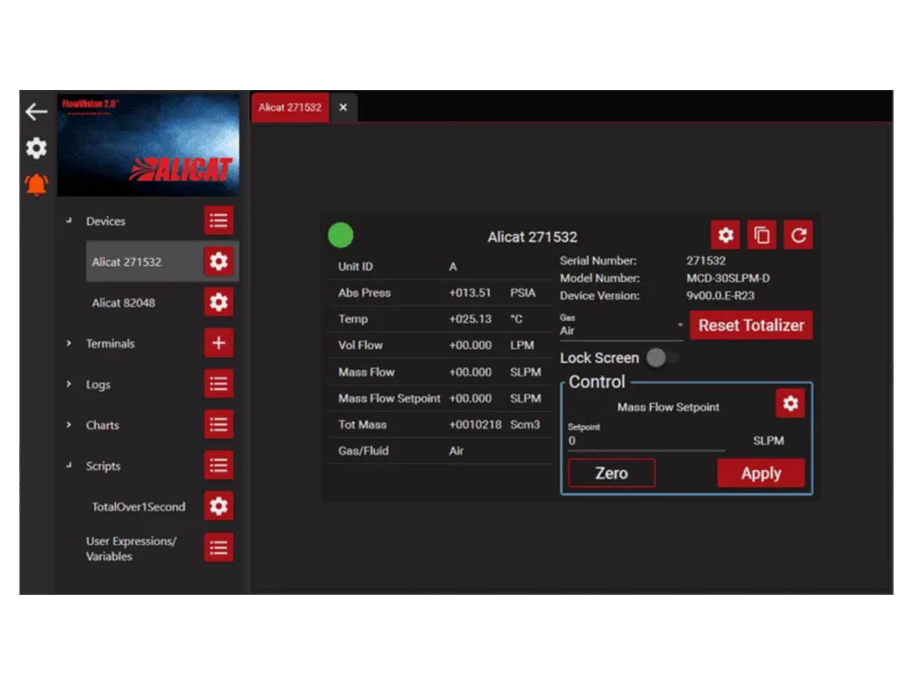 The Alicat Scientific FlowVision 2.0 Software is free software program with a graphical user interface that provides automatic configuration, session saving for easy configuration and experiment setup reloads, data capturing and logging (including a graphing tool), simple and advanced script building for automating meter and control command sequences, software alarms and support for multiple devices.