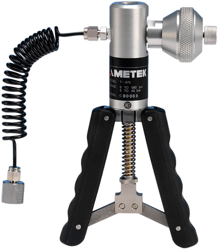 The Ametek T-960 / T-970 Pneumatic Pressure Pumps feature an extended range vernier adjustment for precisely controlling pump pressure and comfortable pistol grip handle. The Ametek T-960 and T-970 Pneumatic Pressure Pumps are compatible with the DPC-500, HPC400, HPC500, HPC502, HPC550Ex, HPC552Ex and IPI units. The T-960 has a pressure range of 0 to 2 / 40 bar and the T-970 has a pressure range of 0 to 30 / 580 psi.