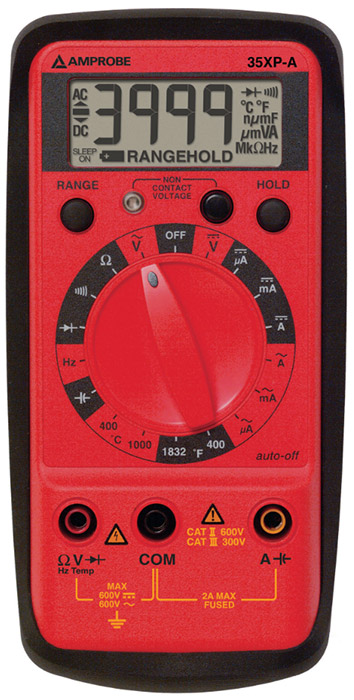Other features of the Amprobe 33XR-A digital multimeter includes an input warning tone when test leads are put in the wrong jacks; Min/Max, Relative, Peak and Data Hold; Auto power-off and a separate door for battery and fuse access.