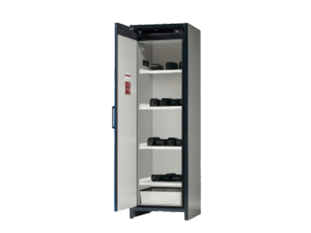 The Asecos Model ION-S series is a storage solution for lithium-ION batteries. It’s triple hinged door offers 90 minutes of fire protection with a scratch and impact resistant surface. The door mechanics are placed outside of the storage compartment, allowing for increased protection. It is self closing with integrated automatic thermal release system and intumescent sealant. The ION-S includes a keyhole with cylinder lock that has a locking state indicator. The integrated open base facilitates easy transportation.