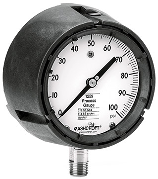 The Ashcroft 1259 analog process gauge has an accuracy of 0.5% full scale and ranges up to 20,000 psi with vacuum and combination ranges available as well. The Ashcroft 1259 analog process gauge features a Bourdon tube available in stainless steel or Monel that has been as-welded for long life and safety. The Ashcroft 1259 analog process gauge features a 4.5 inch dial with an easily adjustable, self locking micrometer pointer while the solid-construction polypropylene case is reinforced for safety.