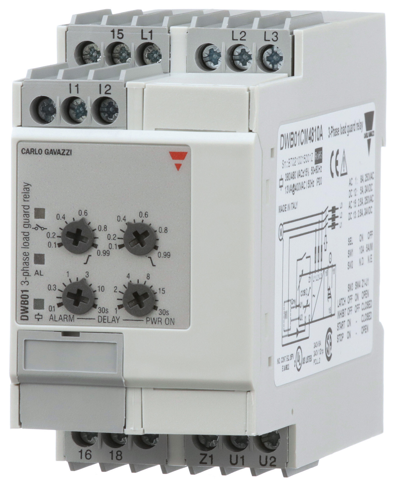 The Carlo Gavazzi DWB01 Monitoring Relay is used for monitoring the actual load of asynchronous motors and other symmetrical loads, where the power factor is almost proportional to the load. The desired function can be set via adjusting the four DIP-switches, which can be accessed by using a screwdriver to open the plastic cover.