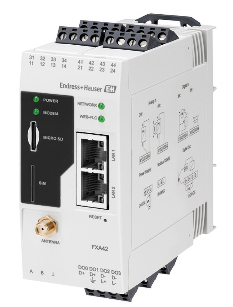 E+H Fieldgate FXA42 is developed for monitoring of field devices with digital or 4 to 20mA interface regardless of location. It supports communication interfaces like Ethernet, WLAN or cellular communication. With its integrated web server technology it can easily be configured online and measured values can be visualized online. FXA42 also offers data logging and alarm management functions.