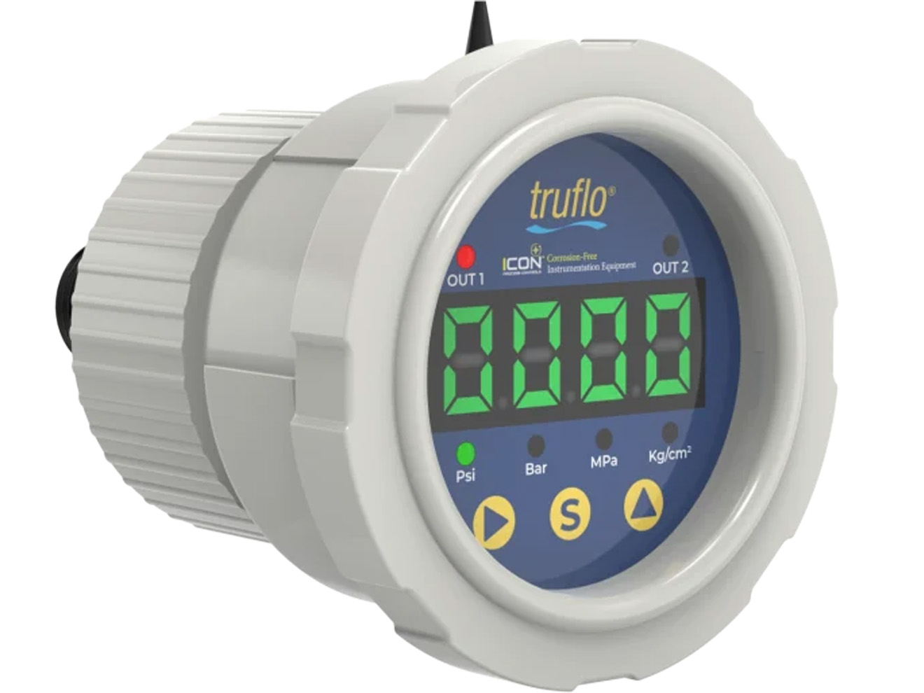 The ICON Truflo OBS-C-LE series pressure gauge is an all plastic digital pressure gauge. The four digit LED display is selectable between Psi, bar, MPa, or kg/cm. The one-piece molded design is built for its heavy duty design and easy installation. The OBS-C series reduces small pressure surges caused by water hammers or metering pump pulsations.