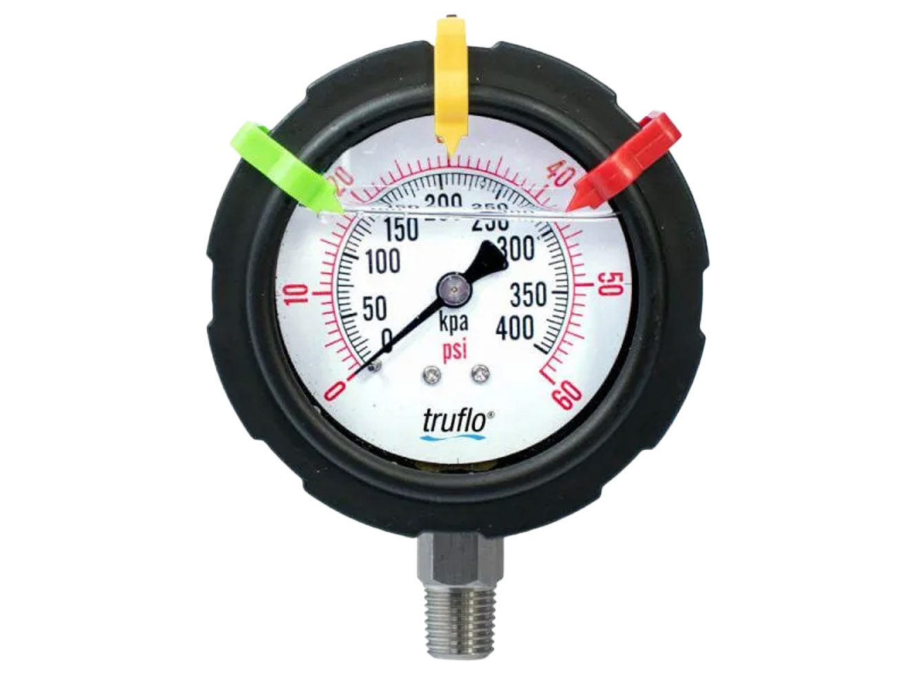 The ICON Truflo OBS-GO series pressure gauge is an all plastic corrosion resistant pressure gauge. It features adjustable green, yellow, and red range tabs designed for indicating optimal operating ranges. The OBS-GO series is built with a heavy duty design and is easy to install. The pressure ranges are available from 0 to 60psi up to 160psi.
