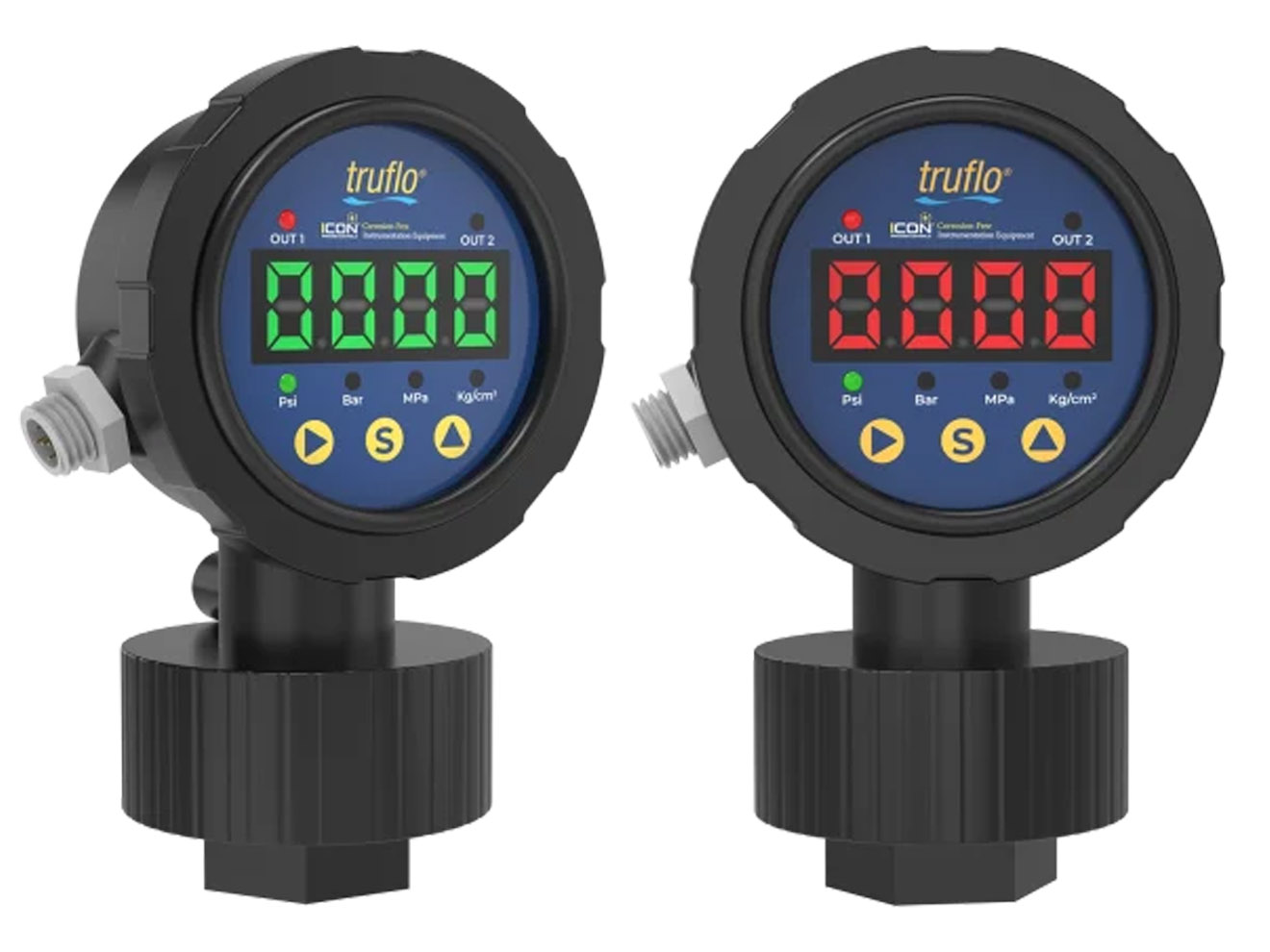 The ICON Truflo OBS-LE series pressure gauge is built with an all plastic one-piece corrosion resistant design. The 4 digit digital display is selectable between psi, bar, Mpa and kg/cm. The OBS-LE reduces small pressure surges caused by water hammer or metering pump pulsations. The OBS-LED has an accuracy of ±1% and is provided with 4-20mA 2 relay outputs.