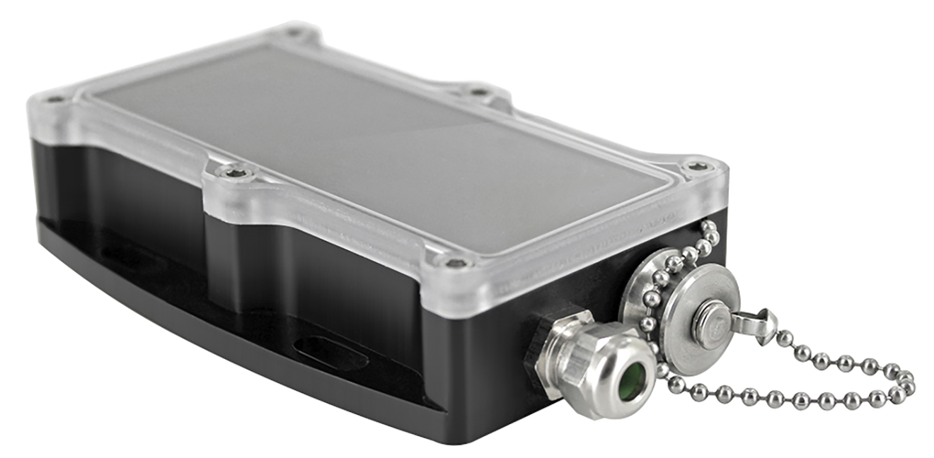 The WaterBox101A is machined out of black anodized aluminum, and has four oval mounting holes for easy surface attachment. The enclosure features a water-tight communication access plug with chain attachment, stainless steel probe outlet and a clear plastic cover.