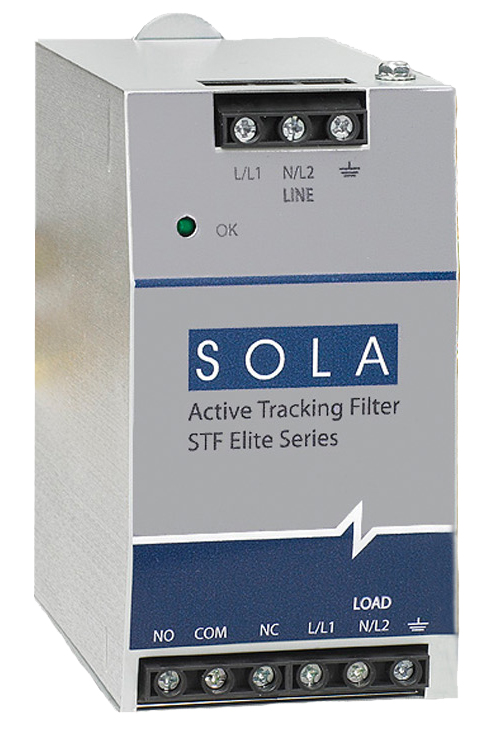 The SolaHD STFE Elite DIN Rail Mount Series Tracking Filter combines SOLA Tracking technology with UL listed surge protection to protect against the full spectrum of voltage transients and surges. It continuously tracks the input AC power line, responding instantly into action upon detecting extraneous high-frequency noise and high-voltage transients caused by everyday events such as turning on machinery, motors, or equipment