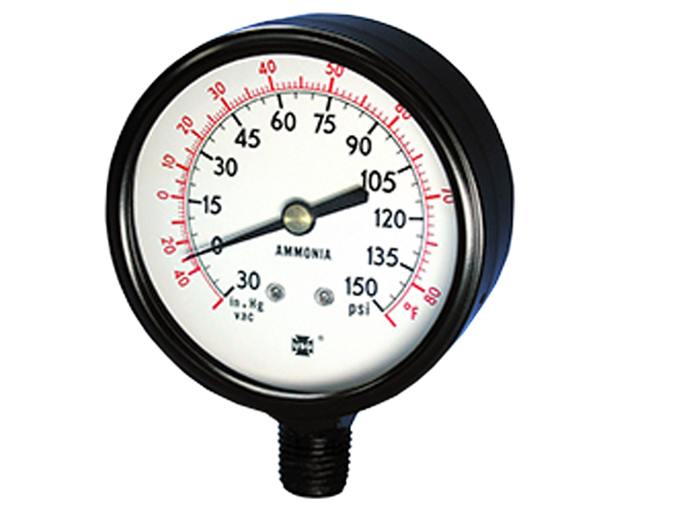 The Model 1706 gauge is usually installed in ammonia refrigeration systems. The 1706 compound gauge can also be used to handle other chemicals not injurious to wetted parts. The silicone dampened movement greatly extends gauge life, particularly on tough services like ammonia compressors. Temperature equivalent scale in red provides easy analysis of refrigeration systems.